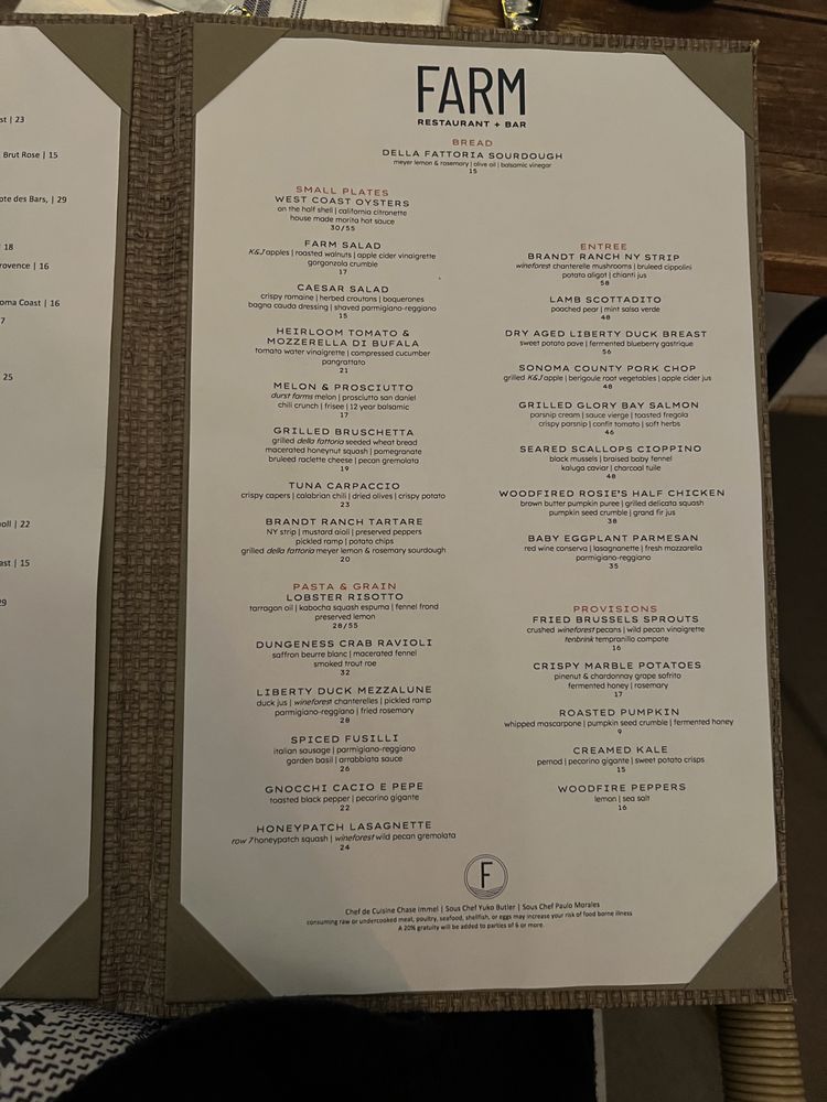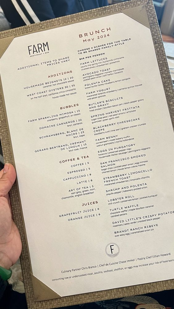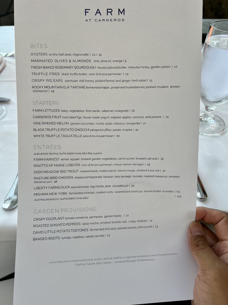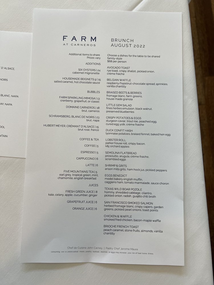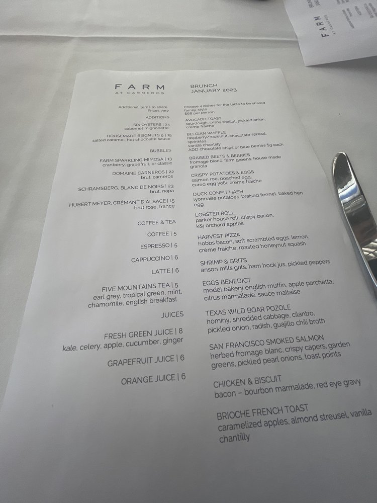 FARM at Carneros is a New American restaurant located at 4048 Sonoma Hwy Napa, CA. Offering a diverse menu with options for pescatarians, vegans, and vegetarians, it caters to a wide range of dietary preferences. Known for its classy ambiance, spacious seating, and excellent service, customers rave about the delicious food and beautiful decor. The restaurant provides a relaxing and upscale dining experience, perfect for special occasions or a lovely evening out. The seasonal menu features carefully crafted dishes, with highlights like the steak and eggs for brunch and the flavorful brussels sprouts and pasta for dinner. With attentive staff, prompt service, and a stunning view, FARM at Carneros promises a memorable dining experience that will leave you wanting to come back for more.