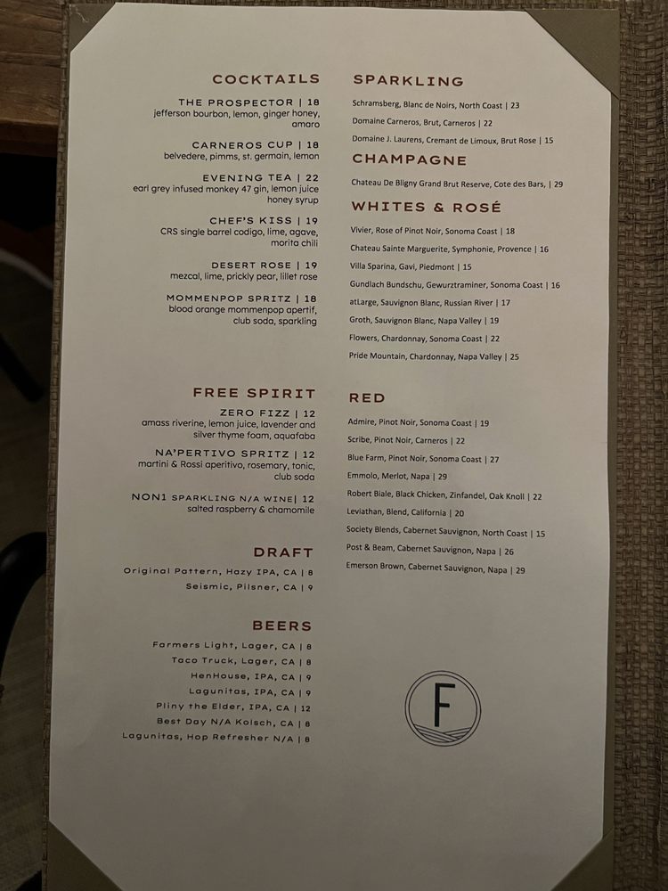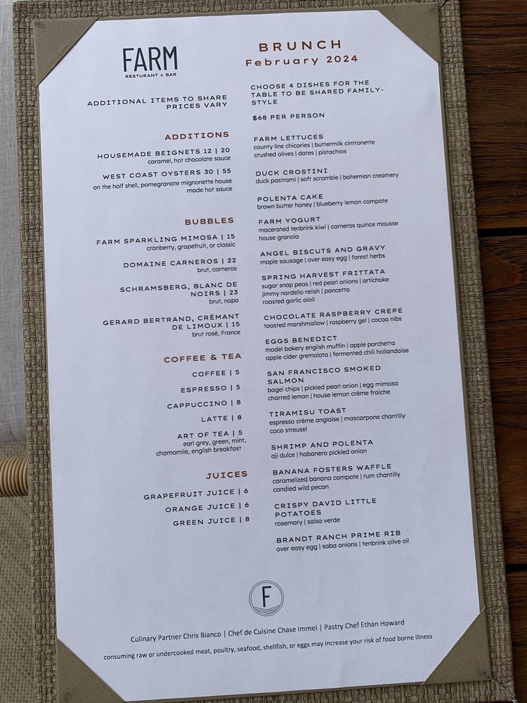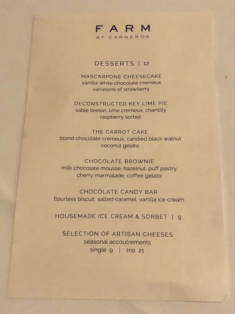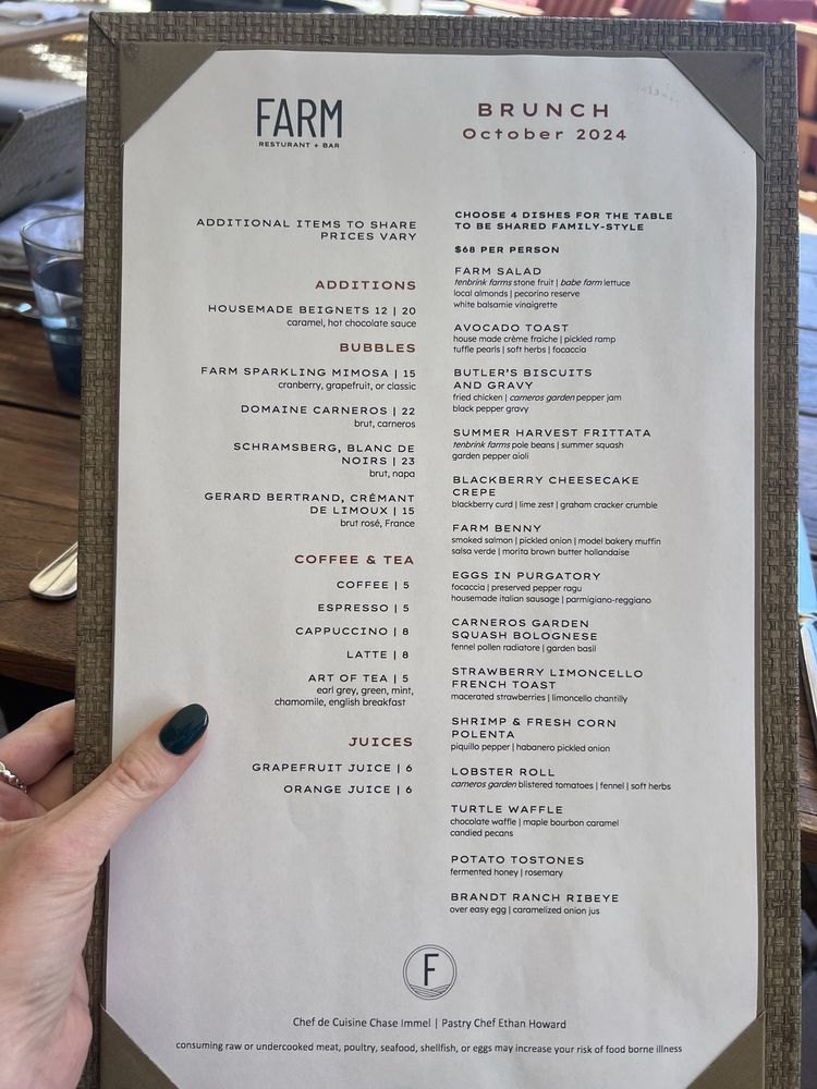 FARM at Carneros is a New American restaurant located at 4048 Sonoma Hwy Napa, CA. Offering a diverse menu with options for pescatarians, vegans, and vegetarians, it caters to a wide range of dietary preferences. Known for its classy ambiance, spacious seating, and excellent service, customers rave about the delicious food and beautiful decor. The restaurant provides a relaxing and upscale dining experience, perfect for special occasions or a lovely evening out. The seasonal menu features carefully crafted dishes, with highlights like the steak and eggs for brunch and the flavorful brussels sprouts and pasta for dinner. With attentive staff, prompt service, and a stunning view, FARM at Carneros promises a memorable dining experience that will leave you wanting to come back for more.